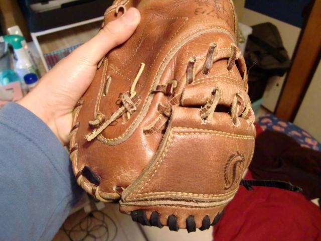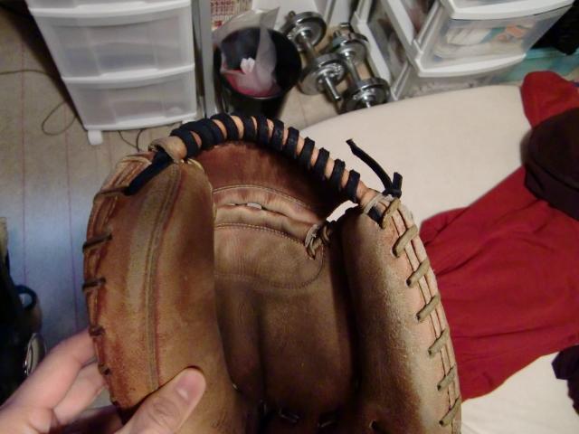 家にグラブの紐があるのでミットを借りて直してみる事にしました