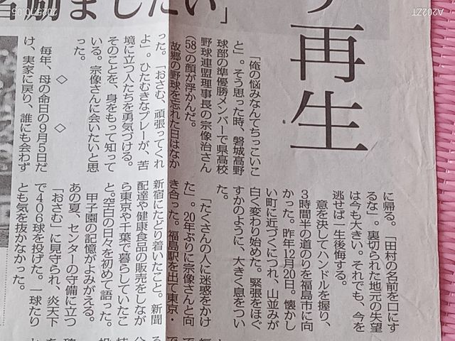 この記事は田村氏が夏甲子園で故郷のヒーローになってから転落しまう人生、そして東日本大震災が有ってからの故郷を思う刹那い気持ちが書かれている。