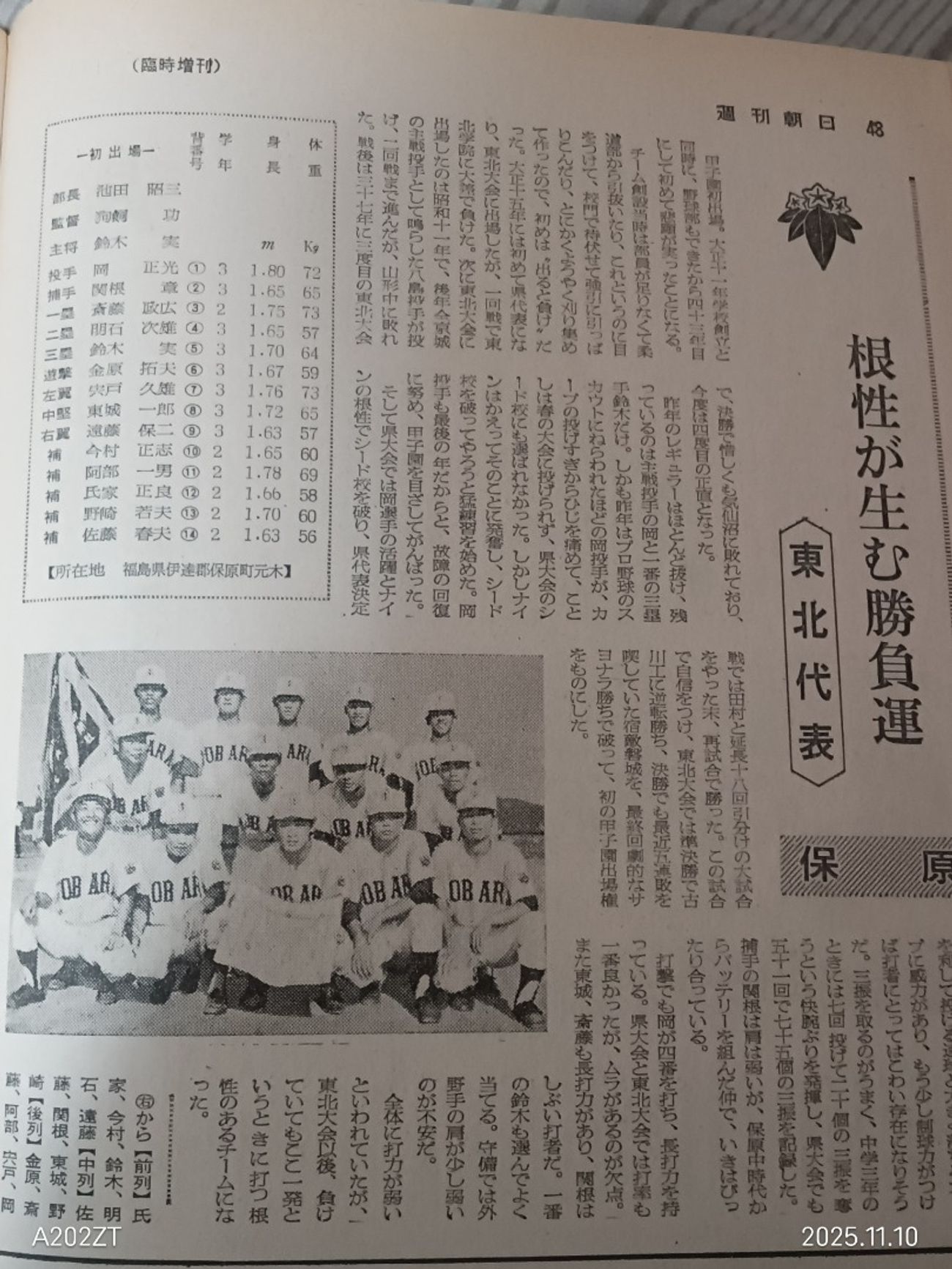 1965年(昭和40年)第47回夏の甲子園大会の福島県大会そしてと東北大会を勝ち上がるので有る。