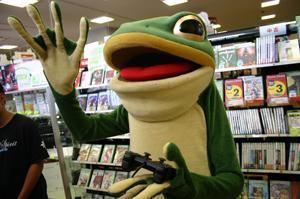 TSUTAYA店内でウイイレを試してみる、一平くん。