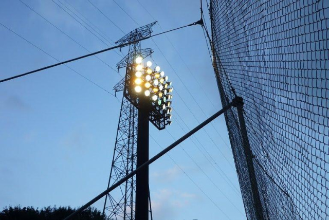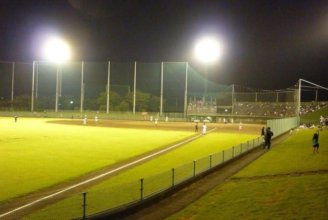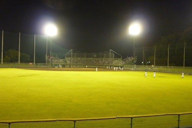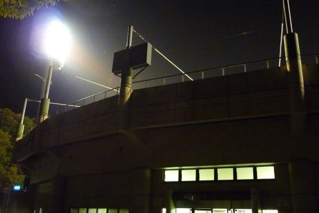 外が暗いので幻想的なナイター外観。かつての佐世保球場を思い出しました。