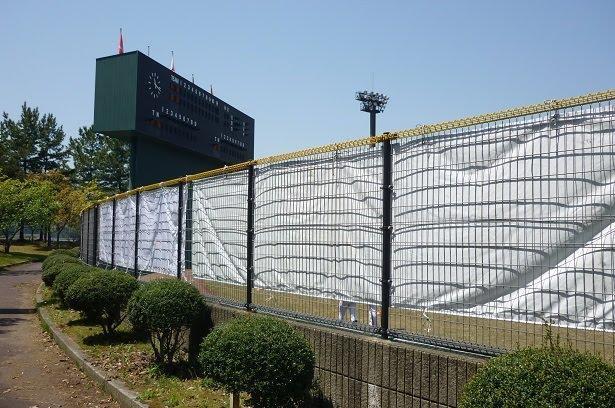 こういう風に目隠しすればいいのですが。ちなみにこれは目隠し用の幕ではなく、球団スポンサーの横断幕です。ですからスポンサー分しか数がないので全面を覆うことは出来ませんでした。あくまでも「スポンサー広告の幕」を張り出しているのであって目隠し用ではないわけです。