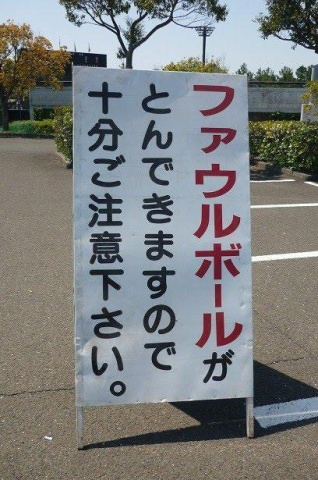 スタンドが低いのと防球ネットが無いのでファールボールのほとんどが場外に出て行きました。これは危ないですね。なので球場横の駐車場にはこんな看板が。そしてこの日この場所は駐車禁止でした。駐車していたらたぶん試合後の車はボコボコになっていたと思います。(苦笑)