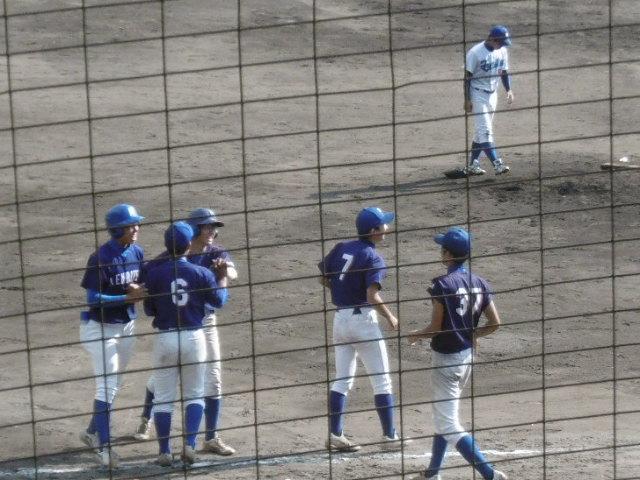 しかし8回裏、県大が反撃。ランナーが3塁にいるところでセカンドゴロ。前進守備はとっていたものの打球が緩かったのでバックホームを焦ったセカンドがファンブルしてしまい、その間にランナーが生還して1-1の同点に追いつきます。
