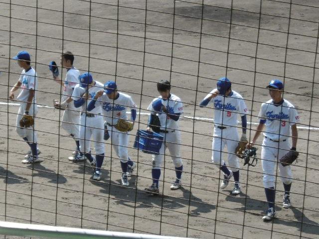 右端はガックリ肩を落とす府大の安川投手。7回の1点は自らのタイムリーで奪ったもの。投打にわたる奮闘は実りませんでした。