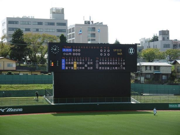 スコアボードは近年LED式に改修されています。ちょっと表示が小さめでしたが、まあまあ見やすかったです。右上にはスピード表示が出ます。