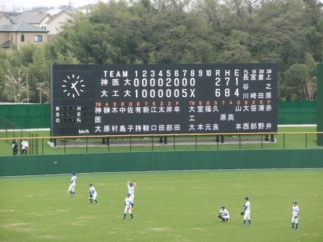 試合は1回裏に大工大がいきなり1点先制。これで同校のペースになるかと思ったのですが、私の予想以上に神医大が食い下がり5回表には2点奪って逆転。(下の写真)