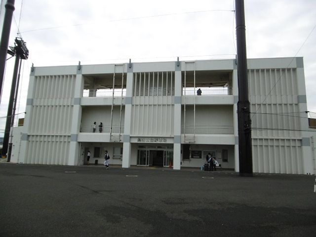 外観は直線的でビルっぽい雰囲気。正面に「運動公園野球場」とだけ表示されています。