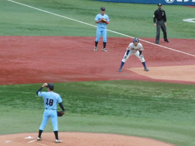 7回まで僅か1安打に抑えられていた商大は8回表に逆襲。連打で一気に4点返して4-4の同点に。地元ですからスタンドは俄然盛り上がりました。