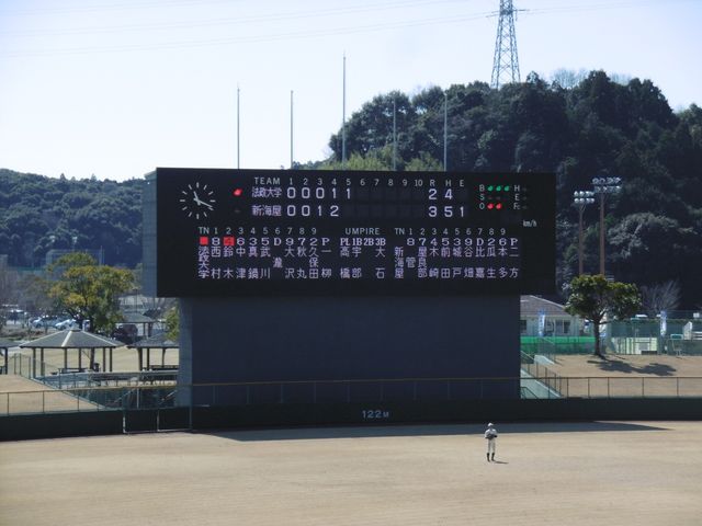 試合は新海屋が押し出しで先制。それを法政が追い上げるという展開になりました。新海屋は守備がやや不安定な感じで、失点こそ少なかったもののバタバタしていた印象。一方の法政は投手の制球がバラついていました。