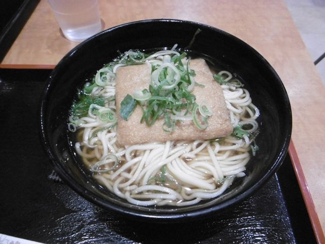 そして「駅そば(写真はきつね駅そば)」。うどん出汁に黄色の中華麺という珍しい組み合わせです。