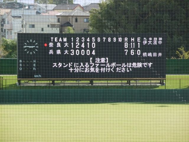 約2時間半で打ち切られ、8-7のまま8回コールドで奈良大の勝ちとなりました。