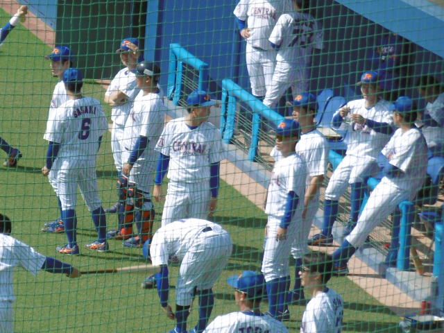 観戦は二度目。前回見た時は黒とオレンジの巨人っぽいデザインでしたが、モデルチェンジしたようで白地に青の縦じまユニ。サブカラーはオレンジ。NYメッツのユニに似ていますね。