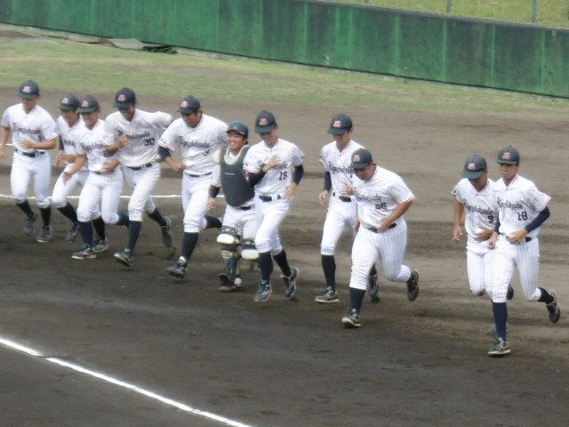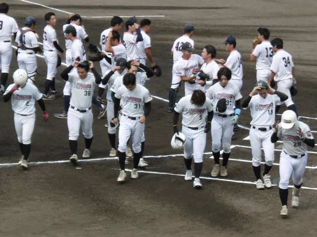 1塁側:東大阪大(意外と読みにくい校名で「ひがしおおさかだい」です。以下「東阪大」と表記)