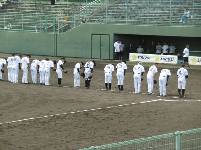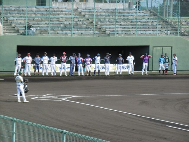 ↑ 試合前に整列したIPBL(日本独立リーグ野球機構)選抜チーム。