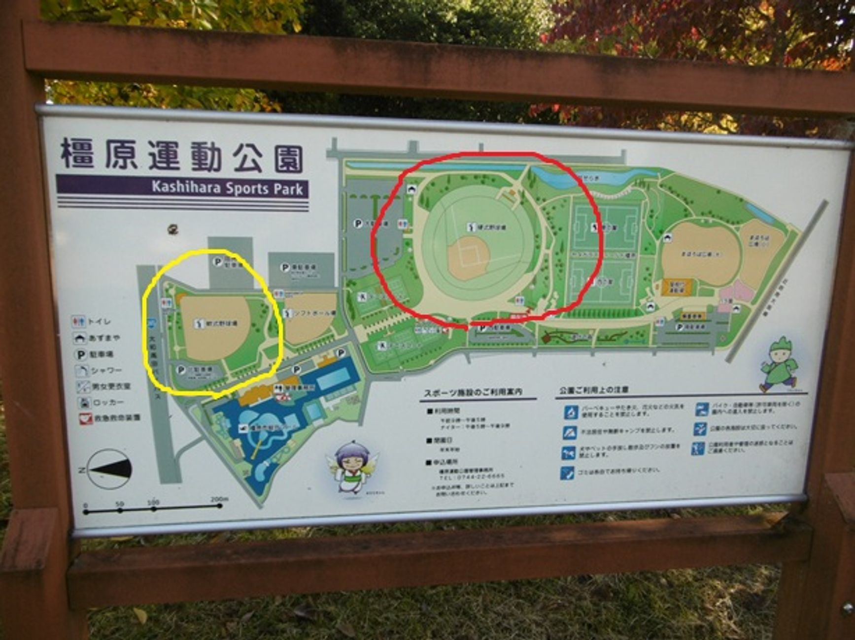 ところで橿原市には硬式野球場が2箇所あり、名称その他で少々ややこしいのでまずはその説明から。