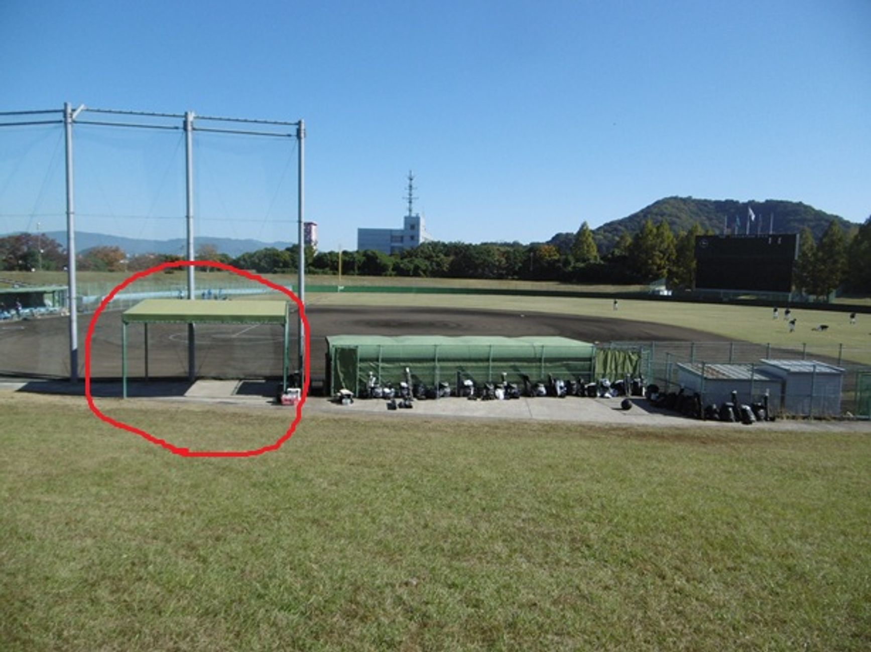 更に用具倉庫(水色)、ダッグアウト(緑)、及びその横にあるテントの影響で視界が悪い場所がかなりあります。このテントは仮設ではなく、コンクリートで固定された常設の物です。
