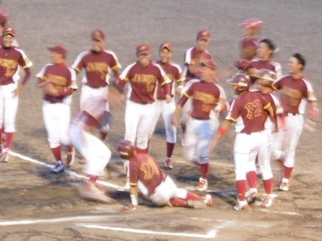 写真はピンボケですがサヨナラ勝ちに湧く名城大選手歓喜の様子。