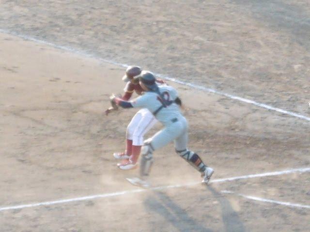 しかし愛院大がピンチをしのいで守り抜きます。写真はホームでのタッチアウトシーン。サヨナラを防いだ場面です。