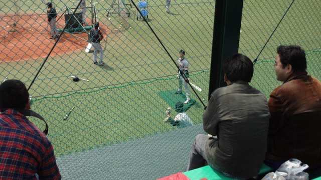 球場内に入るとルーキーの大塁が客席のネットに向かいティーバッティングをしていました。
