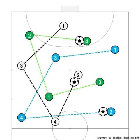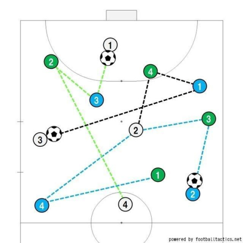 3グループでのランダムパス(青→ビブなし→緑でパス回し)