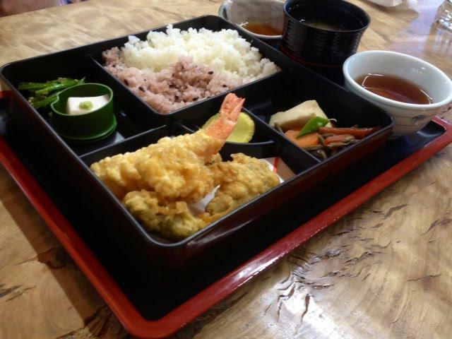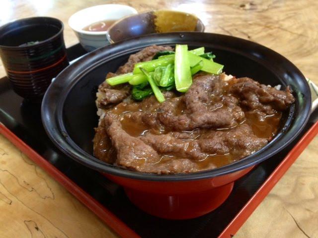 道の駅の食堂で遅めの昼食。熊野牛の焼肉丼と、古代米を使った熊野古道弁当。