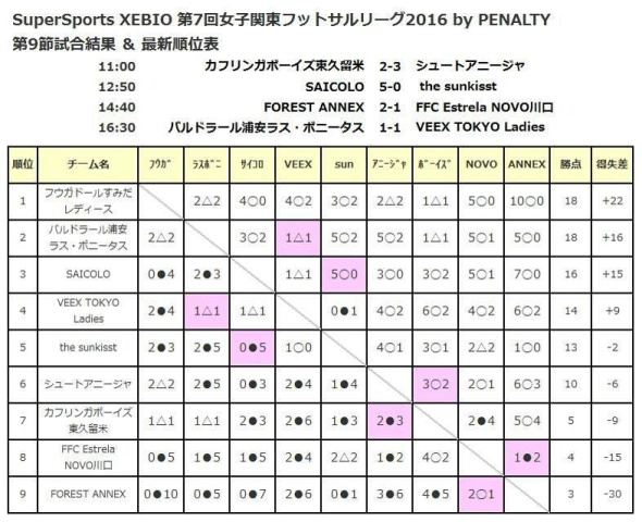 ゼビオ関東女子Fリーグは本日第9節がありました。9チーム総当たりを一巡し上位下位リーグに分かれて2ndステージへ。現時点で自力優勝の芽があるのはフウガ、ラスボニ、そしてサイコロ。しかし全勝するチームがいなければVEEXやsunkisstにもまだ可能性あり!