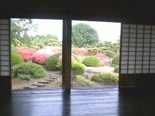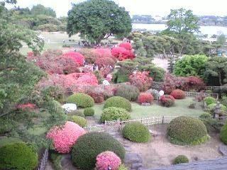 写真はつつじの花で赤く染まった偕楽園の庭園です。