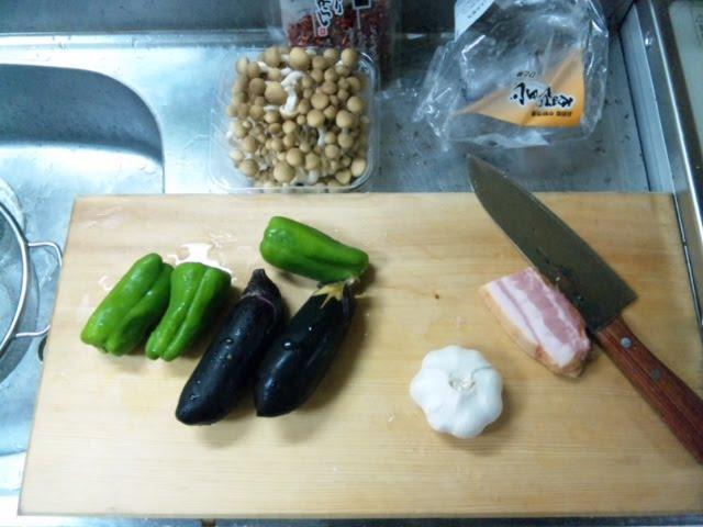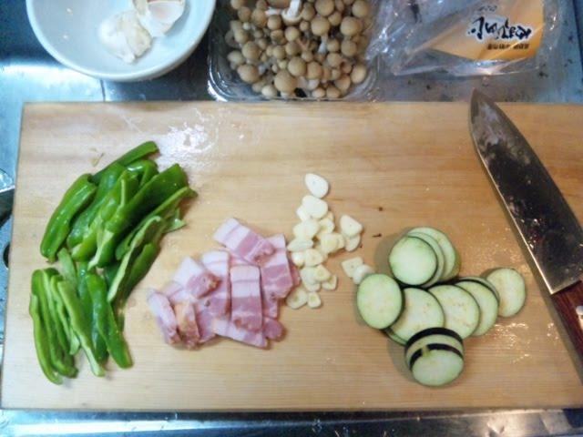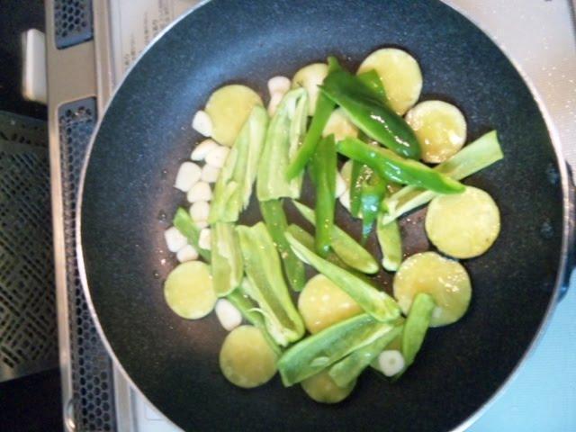 なんとなくのタイミングで ピーマンとにんにくを 入れます。