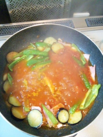 ちと それとは違うんですが 自分がいつも作ってるトマト味のパスタを・・・。
