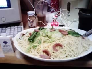 さて、今日も 塩味の スパゲティ で かさましの為に キャベツ どっかり 入れてます。