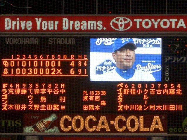 9表 投手クルーン。先頭平田8前、谷繁四球、代打中村8越2塁打6ー4。0アウト2、3塁。