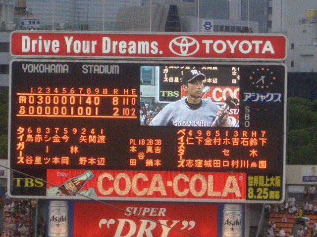 6裏 ここまで淡々と進む中、2アウトから吉村レフトスタンドへソロ、1ー3。タクロー四球、相川の打席で阪神投手久保田。下柳6回2/3を7安打1失点。タクロー盗塁、完全にアウトのタイミングを鳥谷落とす。相川9前1、3塁で三浦に代打古木。粘ってフルカウントも空振三振…流れをつかみきれない。