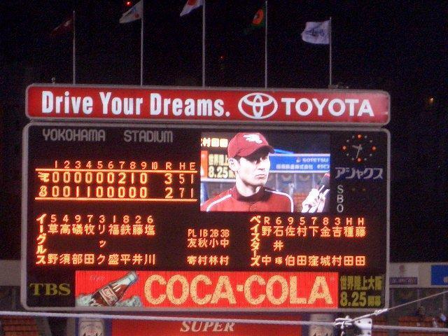 7裏 楽天投手松本。永井6回を6安打2失点。仁志四球で楽天投手吉田。タクロー進塁打、2アウト2塁で佐伯四球、村田のとこで小倉。しかし村田三球三振…