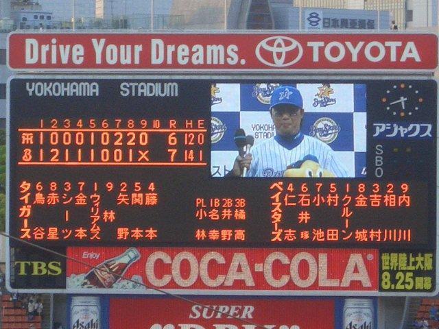 4表 1アウトから矢野ヒット、関本2塁打、代打出さずジャン三振。代えればいいのにと思うが…鳥谷四球満塁。また斉藤コーチがマウンドへ。そのあかげで赤星3直、0点。明夫効果は絶大。