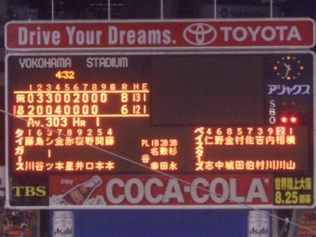 4裏 先頭仁志2塁打、タクロー最低の3ゴロをシーツトンネルで3ー6。金城7前0アウト1、2塁。村田9犠飛1アウト1、3塁。佐伯何とライトスタンドへ3ラン6ー6。