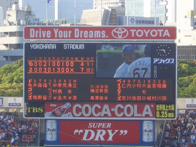 8裏ニシレフトオーバーも好辺球で2塁噴死。連続ヒット記録は残す。タカノリヒット、村田四球で打率.667陰の4番ホセロ。ポール際大ファールあるも三振。