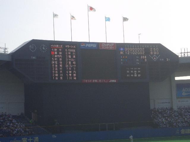 9表 ロッテ投手渡辺に代わり川崎。渡辺8回5安打2失点。バス込むからこれにて観戦終了。千葉まで日焼しにきたものだ。