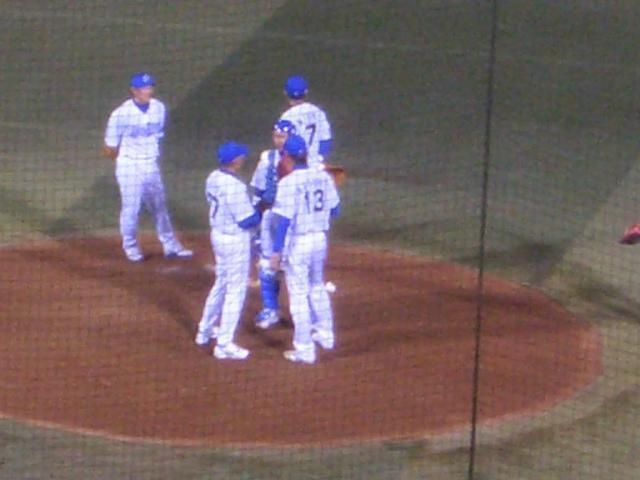 鶴岡ヒットで勝ち越しのチャンスに那須野がそのまま打席に。監督始めみな那須野に勝ちをつけて泣かせたいらしい。その那須野はありえない粘りながらも3邪飛。ぬるい試合の結ががぜん楽しみに。