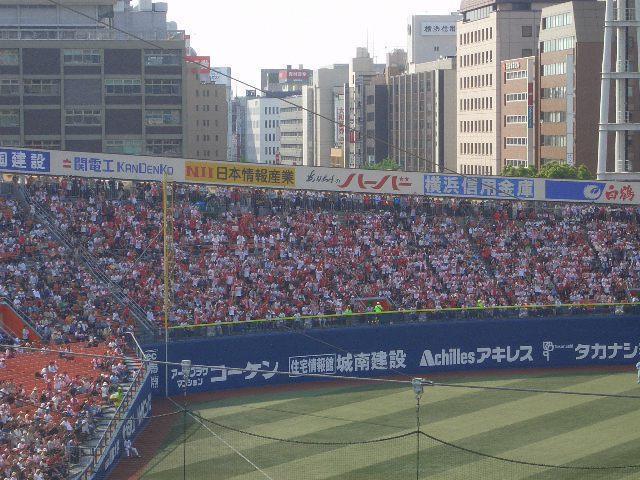 2裏 先頭村田レフトスタンドへ特大ソロ1ー0。佐伯ヒット、金城3前にセーフティバントと栗原送球ミスで0アウト2、3塁。チャンスに弱い吉村4直も、久しぶりのマスク鶴岡が前進守備の6左を抜く適時打3ー0。1アウトから尚典ヒット、村田3塁打、4ー0。佐伯1塁線破る2塁打、5ー0。金城ヒット、6ー0。吉村ヒット、1アウト1、2塁。鶴岡2塁打8ー0。佐々岡見殺し…