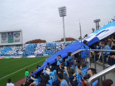 横浜側。あのでっかい旗?このチームで出すの初めて見た。今日は前から7列目くらいに。選手の支持の声まで聞こえる。三ツ沢最高!