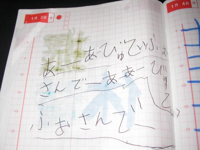 私の使ってない手帳がいつの間にやら娘の日記帳(落書帳?)になっていた。