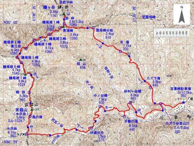 鎌尾根(地図左の稜線)はピークを登って下るの繰り返し(7回)
