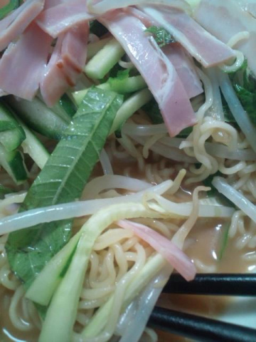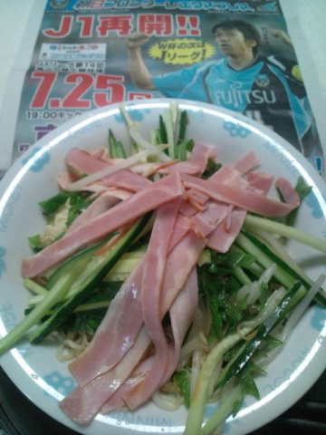 さすがに暑いから冷やしラーメンつくりましたそして週末はサンガ戦!いまから入れ込み気味(笑)具は庭で採れた大葉と胡瓜にスーパーで買ったもやしにベーコンでした。