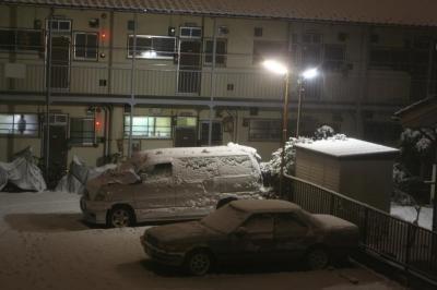 駐車場の照明に照らされたワゴン車にはもう雪が積もっています!