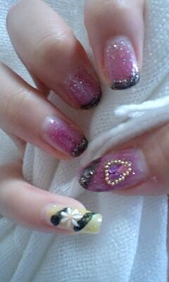親指だけは、黒ラインを斜めに入れてピンク、紫のストーン置いて