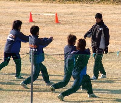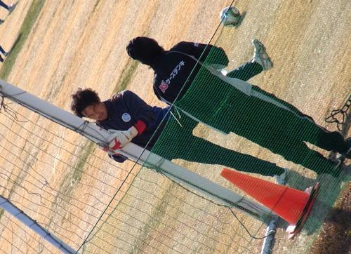 1人ストレッチの後はキーパーコーチと若手キーパーで練習