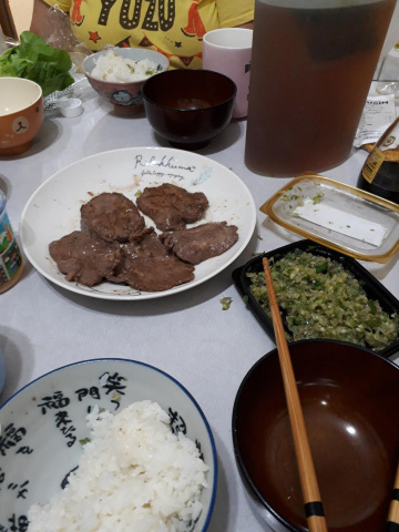 国産牛焼肉。うちはホットプレートを妻が使わせてくれないので僕が毎回わざわざフライパンで焼きに行くという(苦笑)あと肉は思ったより固かった(苦笑)
