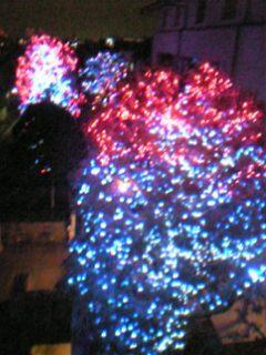 手前の木にも、いつのまにかイルミネーションの電飾が!!近っ(窓から約2mのとこ)!!