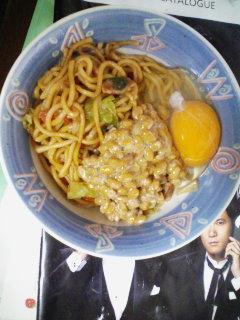 嫁さんが冷凍で送ってくれた焼きそばに、納豆と卵でたんぱく質アップです…。